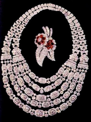 Mounts to turn three of the bracelets into a bandeau to be worn in the hair were added from Cartier in 1925. The Queen Mother wore the bandeau through the early 1930s, and the bracelets haven’t been seen as a bandeau since. She also regularly stacked the bracelets on one wrist. (A frequent question: what necklace is she wearing in the bandeau picture above? It’s impossible to tell what stone that is, thanks to the black and white, but she did have a sapphire and diamond chain necklace made in 1929 and this could be it. It is unknown whether that necklace is still in existence.)