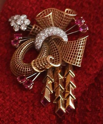 One of many wedding gifts received by Princess Elizabeth for her 1947 marriage to Lieutenant Philip Mountbatten, this gold brooch was given by the Jewelers and Silversmiths of Great Britain. It was described on the official wedding list as "a gold lace-work brooch set with diamonds and rubies," which is obviously where the name I'm using for the piece is pulled from.