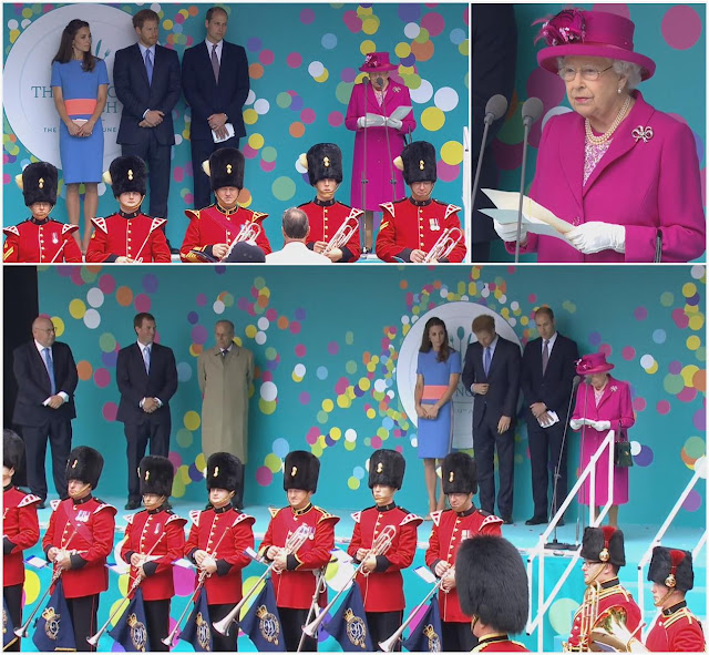 With The Prince of Wales and The Duchess of Cornwall dispatched to cover the local celebrations elsewhere, The Duke and Duchess of Cambridge and Prince Harry led the rest of the family. Kate continued to solidify my feelings that she should stick to simple but bold modern looks with this color blocked Roksanda dress. Suits her so well