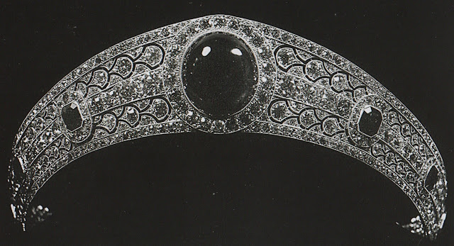 Mounts to turn three of the bracelets into a bandeau to be worn in the hair were added from Cartier in 1925. The Queen Mother wore the bandeau through the early 1930s, and the bracelets haven’t been seen as a bandeau since. She also regularly stacked the bracelets on one wrist. (A frequent question: what necklace is she wearing in the bandeau picture above? It’s impossible to tell what stone that is, thanks to the black and white, but she did have a sapphire and diamond chain necklace made in 1929 and this could be it. It is unknown whether that necklace is still in existence.)