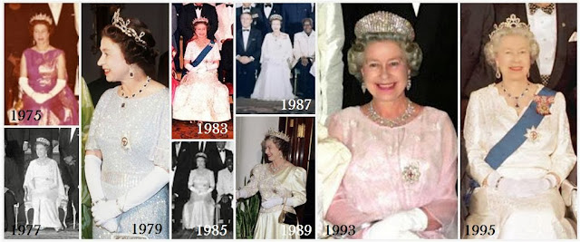 The CHOGM summit officially began in 1971 and the Queen started to attend in 1973. The 2013 Sri Lanka meeting is the first she's missed, as the palace stated her long-haul travel amounts are under review. This flashback covers the tiara-filled CHOGM banquets over the years. (It does not include every year, nor every jewel from those years represented - only identifiable pieces are mentioned, and evening watches are not included - and it does not cover dinners held for Commonwealth leaders prior to the 1971 time frame. Most of these appearances include the