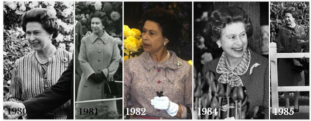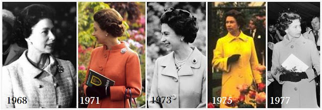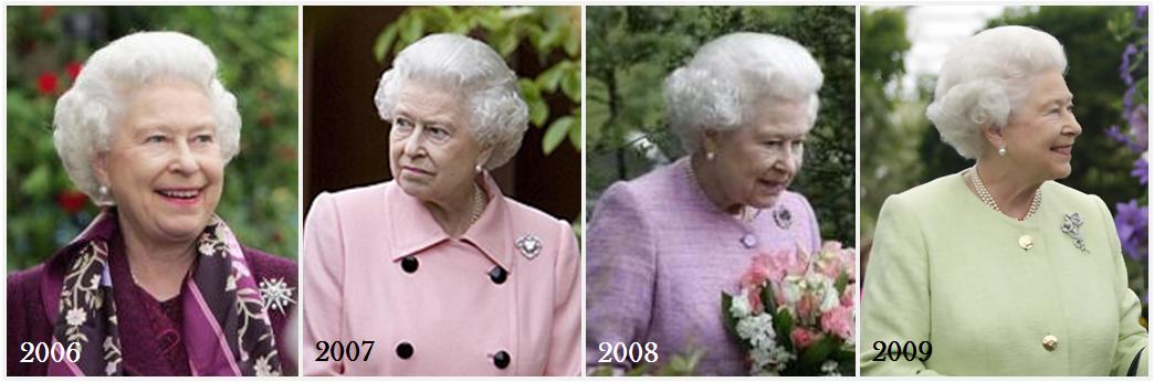 The real standouts at the Chelsea Flower Show are actually not the jewels, but the headgear, to tell you the truth. Up until 1967 the Queen wore a hat, but from 1968 on she's gone hatless, arriving in either a headscarf or one of her hairnets studded with bows or little flowers...which is an interesting look, to say the least.